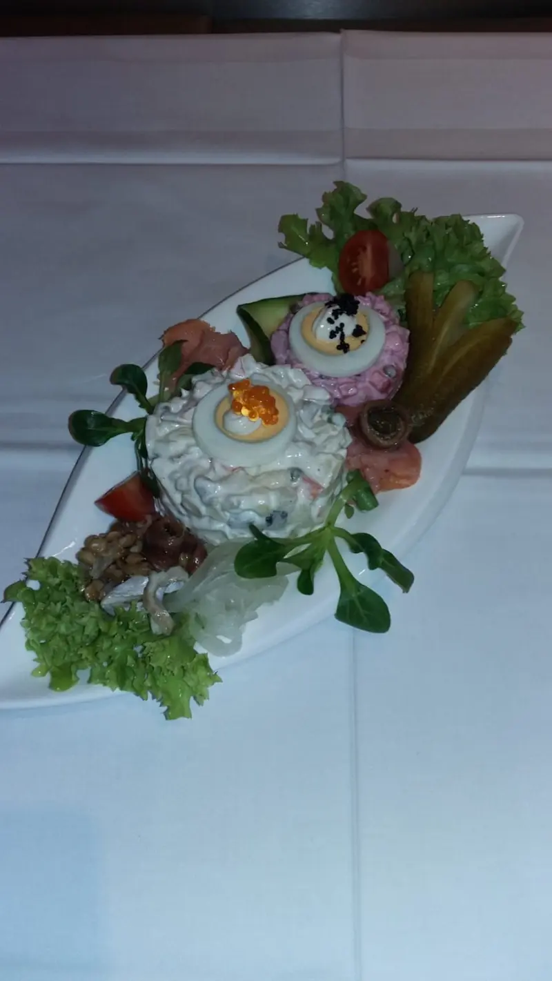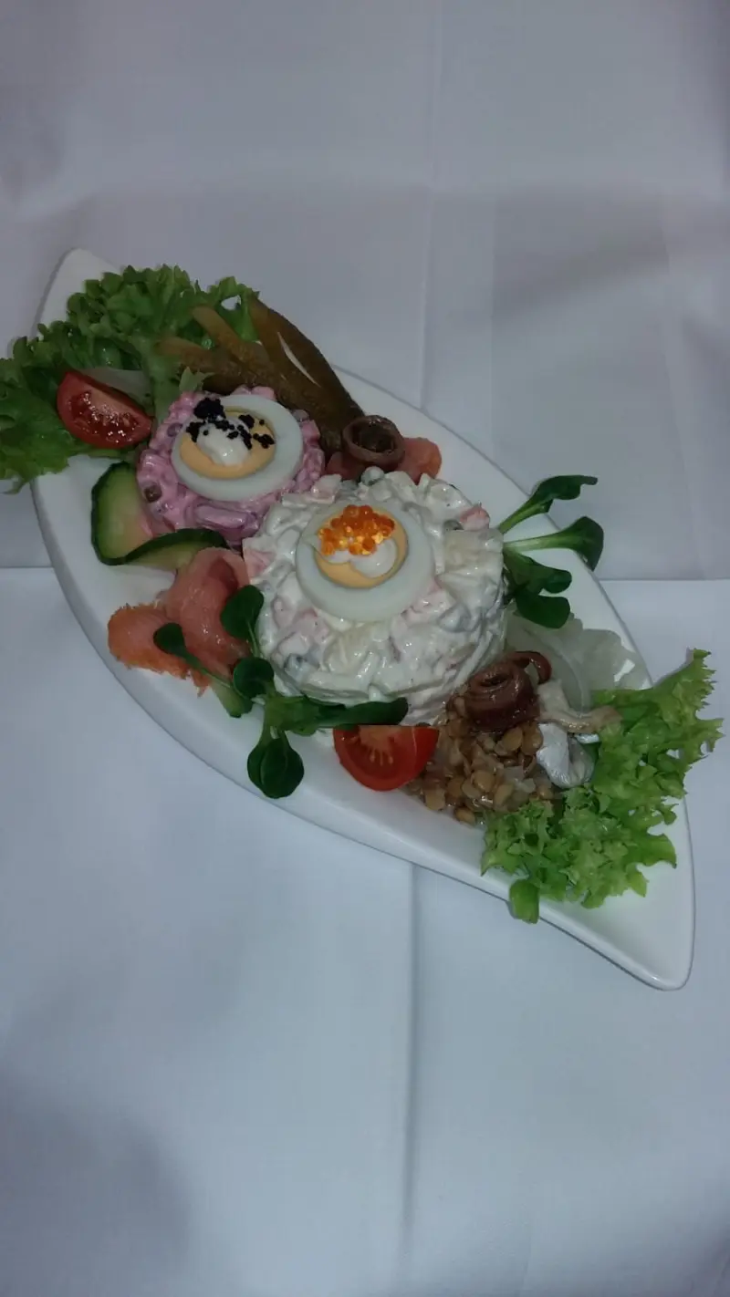 Unsere Empfehlung bis Aschermittwoch: Zweierlei Heringssalat (Hering-Matjes-Russen-Brados) fein garniert mit Gebäck
