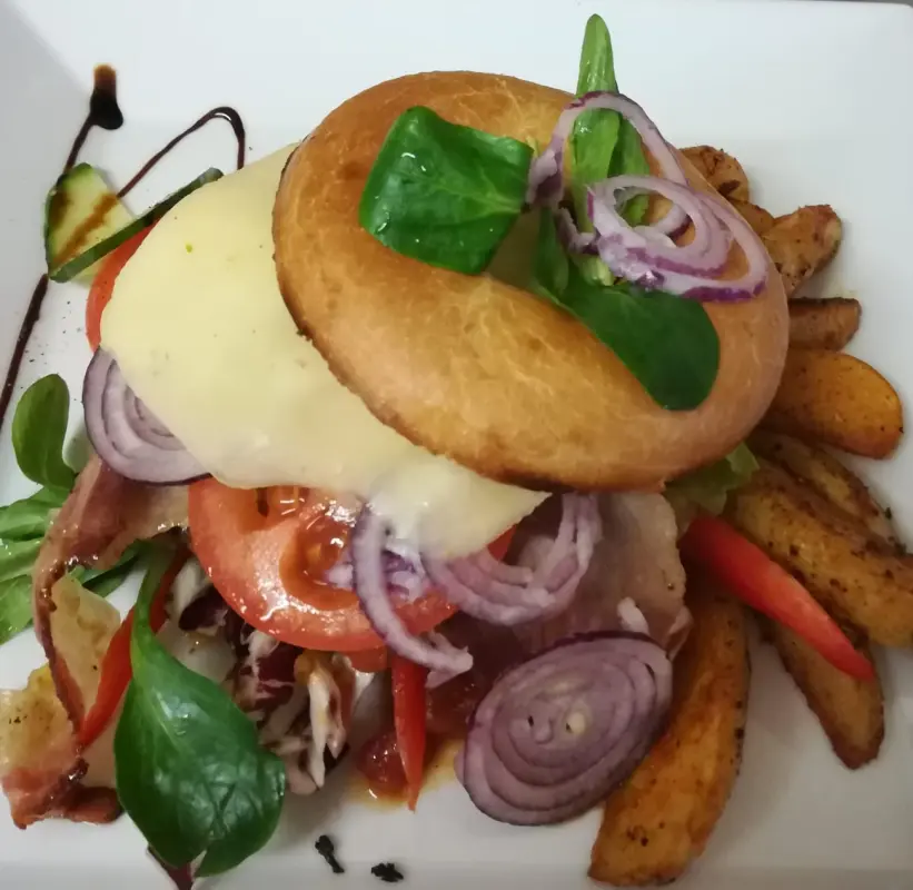 € 12,50- zur Zeit nicht im Programm - Rindfleisch, Käse, Zwiebel, Essiggurke, Tomatenscheibe, bunter Salat, Grillsauce, Pommes. ACFGNM