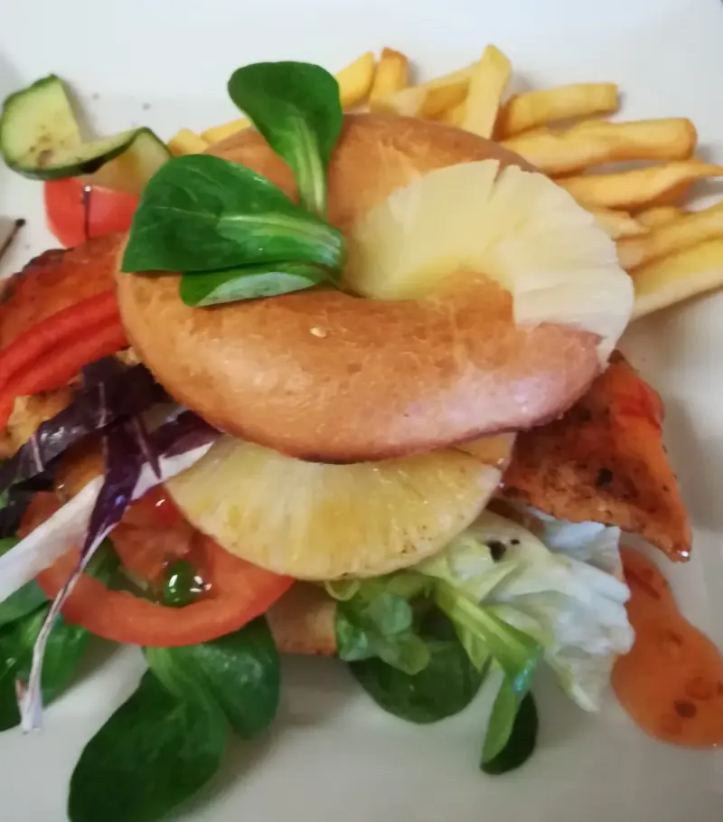 € 12,50zur Zeit nicht im Programm - Hühnerfleisch, bunter Salat, Tomatenscheibe, Chilli Sauce, Pommes. ACFGNM